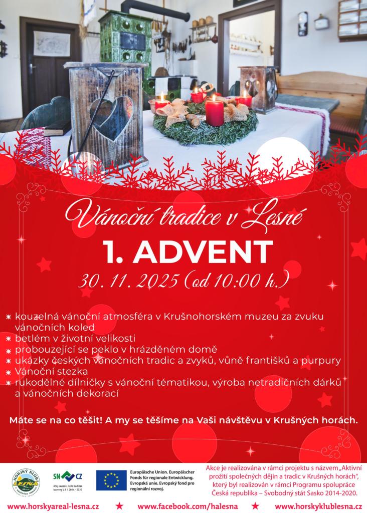Zveme vás na 1. advent a adventní koncert folklorního a tanečního souboru Krušnohor, který se uskuteční 30. listopadu 2025. Koncert proběhne ve slavnostních prostorách Hrázděného domu v Lesné. Tato akce je součástí akce „Pekařského dne“.