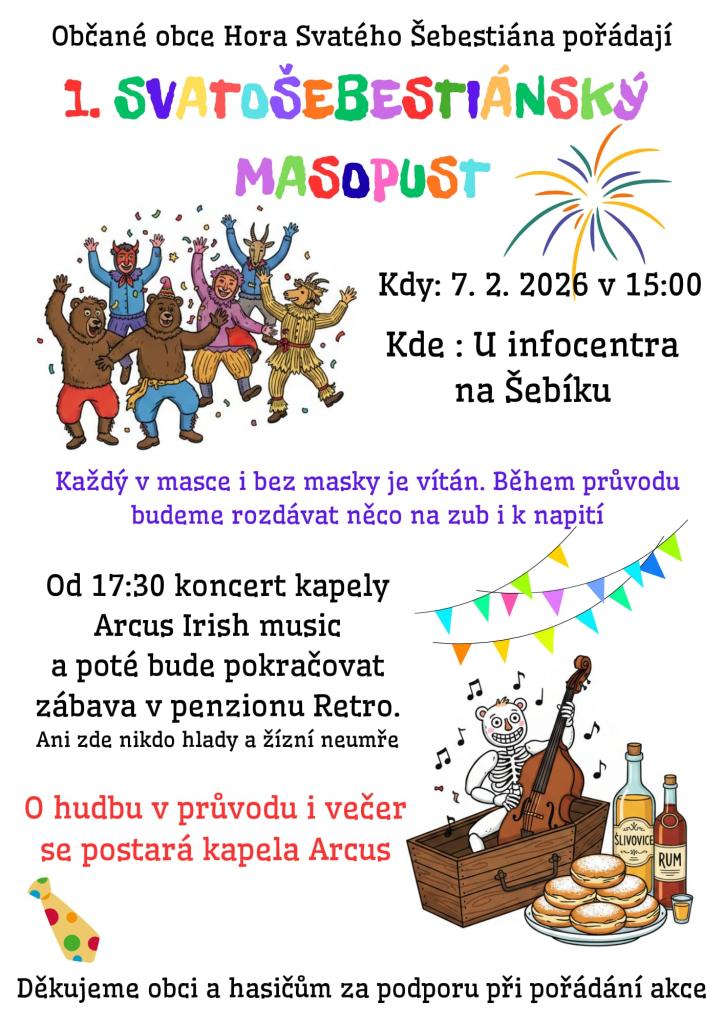 Občané obce Hora Svatého Šebestiána vás zvou na Svatošebestiánský masopust, který se koná 7. února 2026 od 15:00 u infocentra na Šebíku. Každý je vítán, ať už v masce či bez ní. Během průvodu se bude rozdávat něco na zub i k pití. V 17:30 začne koncert kapely Arcus Irish music, který bude následovat zábava v penzionu Retro. Přijďte si užít den plný hudby a zábavy.