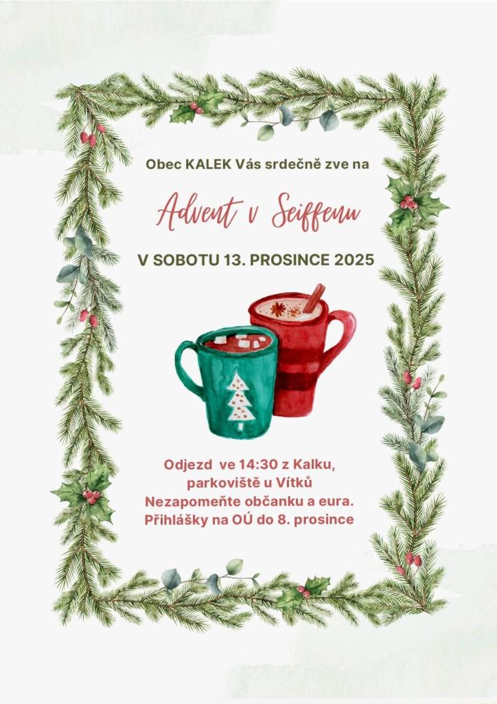 Obec Kalek pořádá v sobotu 13. prosince 2025 zájezd do vánočního Saiffenu. Odjezd je ve 14:30 z Kalku, z parkoviště od Vítků. S sebou je potřeba si vzít občanský průkaz a eura. Přihlásit se můžete na OÚ.