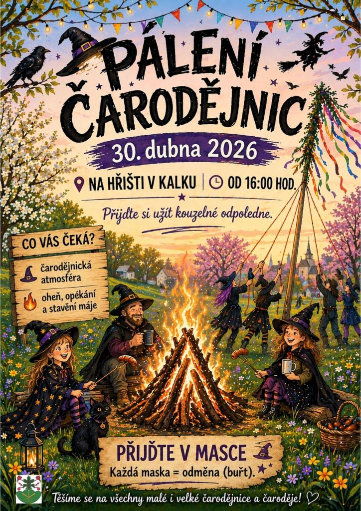 Zveme Vás ve čtvrtek 30. dubna na PÁLENÍ ČARODĚJNIC. Začátek je v 16 hodin na hřišti v Kalku. Masky a kostýmy jsou vítány a budou odměněny. Těšíme se na Vás. SDH a obec Kalek.